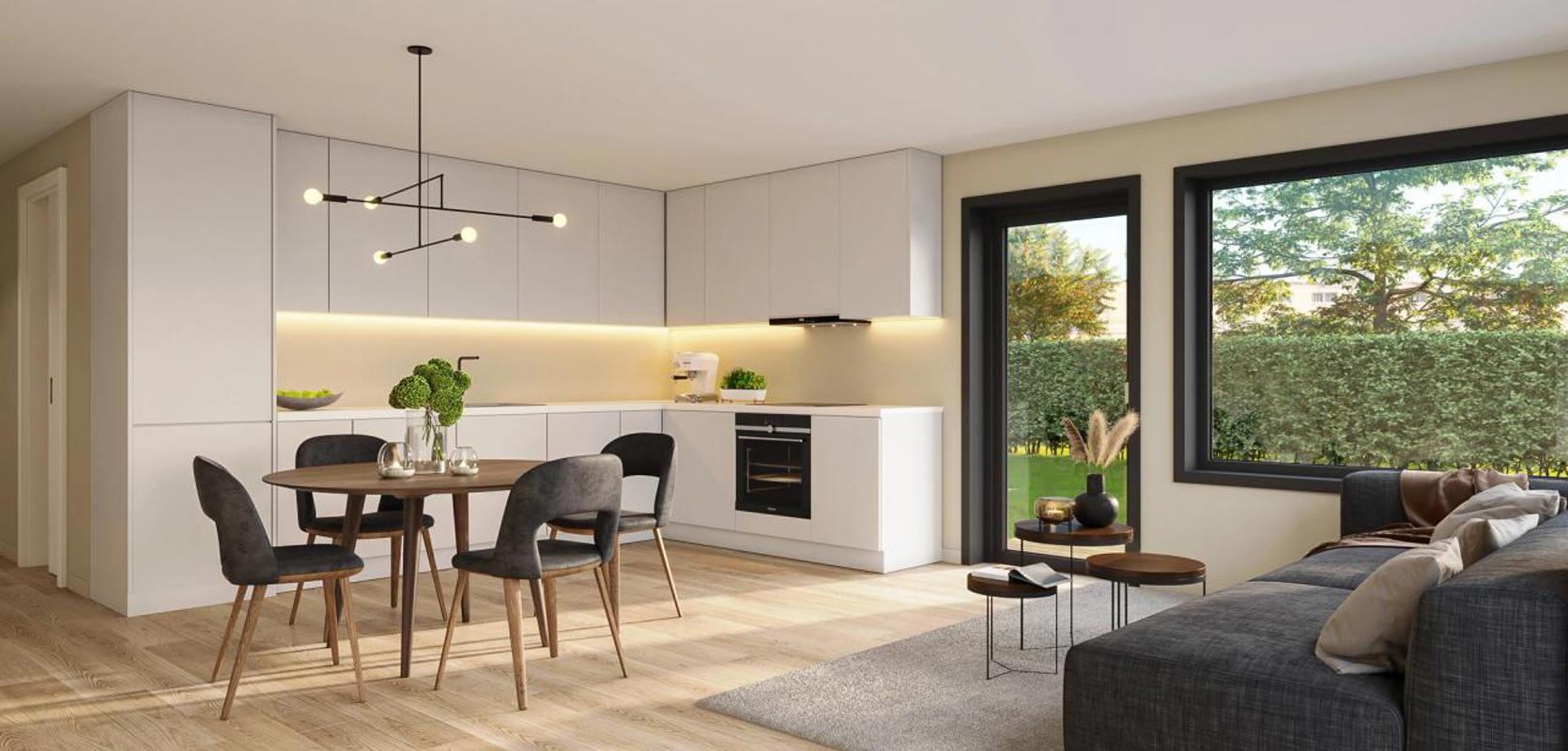 Planløsningen er åpen og praktisk, med naturlige soner for både samvær og hvile. Kjøkken og stue er samlet i ett sosialt hjerterom med godt lysinnslipp og enkel tilgang til uteplass. Her er det rom for å samle hele familien – eller bare nyte en stille morgen med kaffekoppen.