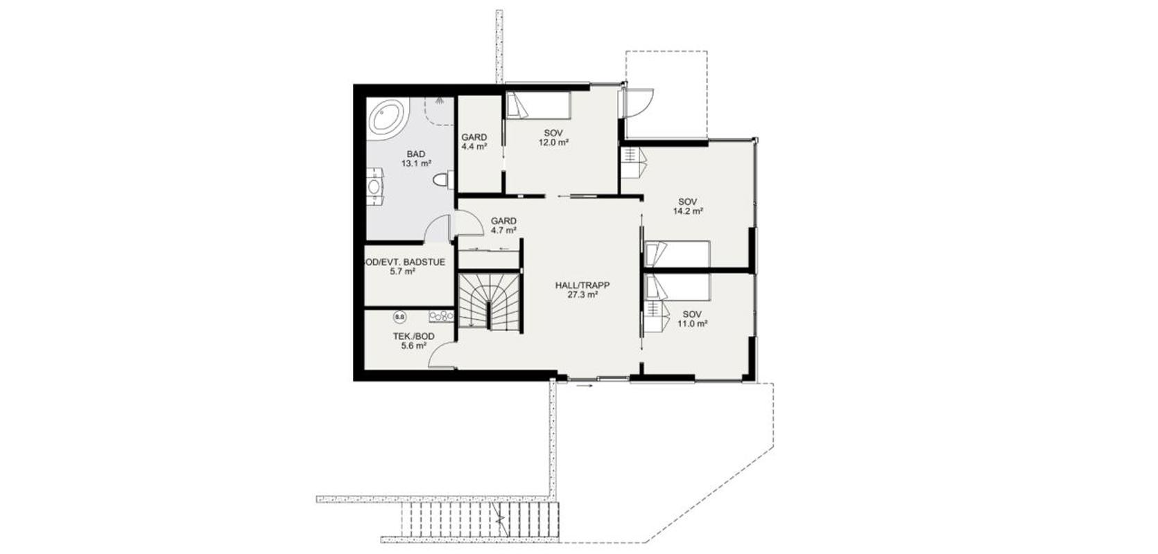 Uteplassene er like imponerende som interiøret. Fra kjøkken- og spiseavdelingen kan du enkelt stikke ut til den sjarmerende frokostbalkongen, eller slappe av på den store hjørneterrassen. En trapp fører deg videre opp til takterrassen over garasjen. Garasjen er perfekt integrert i huset, og har til og med en romslig sportsbod for praktisk oppbevaring av sykler, bildekk, ski og annet sportsutstyr.