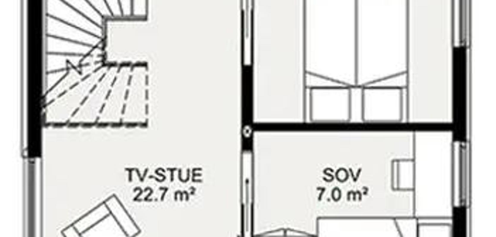Denne versjonen av Alta har fått et stilig overbygd inngangsparti, med en praktisk sportsbod rett ved inngangsdøren. Der kan man enkelt sette fra seg barnevogn, sparkesykler, akebrett og andre ting en aktiv familie har, men ikke trenger å ha med inn i huset. Når du kommer inn har du garderobe og vaskerom rett innenfor døren. Alle våte klær kan gå rett til tørk og vasking. Du har også et bad i gangen. Det er tre soverom i første etasje, hvorav det største har et romslig walk-in-closet. Det er også en TV-stue i denne etasjen, som har dør ut mot den overbygde plattingen og hagen. På grunn av den ene veggen som går ned fra fasaden her, så får man en lun og skjermet uteplass.